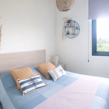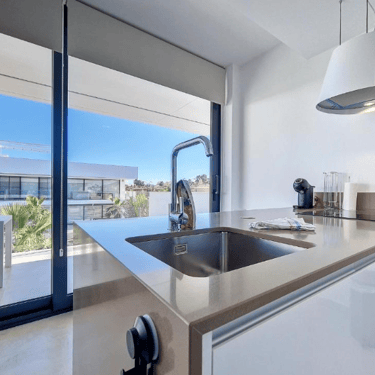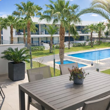 La pièce de vie principale, élégante et lumineuse, se compose d’un salon-salle à manger d’environ 25 m², ouvert sur une terrasse de 16 m² invitant à la détente et aux repas en extérieur. Depuis cet espace, un accès direct mène à un exceptionnel solárium privé de 80 m², véritable atout de la propriété. Offrant des vues dégagées sur les jardins paysagers, la piscine de la résidence et le Mar Menor, il constitue un cadre idyllique pour profiter du soleil méditerranéen, organiser des soirées raffinées ou simplement contempler l’horizon en toute intimité.