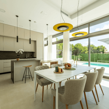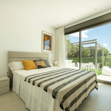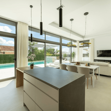 Terrain : 800 m². Piscine privée : 10 m x 3,5 m, avec cascade en acier inoxydable. Cuisine principale : Entièrement équipée avec îlot et design moderne. Plan de travail et façade en Silestone ou similaire. Électroménagers inclus : réfrigérateur, four, lave-vaisselle, plaque vitrocéramique, lave-linge, hotte aspirante et aérotherme. Cuisine d'été : avec îlot, installation électrique, plomberie et évier. Salles de bains : sanitaires en porcelaine vitrifiée. WC suspendus avec réservoirs cachés. Robinetterie mitigeur (argent dans les toilettes, noir dans les salles de bains principales). Miroirs, parois de douche noires et receveurs de douche en acrylique. Confort et efficacité : pré-installation de la climatisation et du système Airzone. Eau chaude sanitaire par aérotherme. Points d'eau dans le jardin. Éclairage LED et pré-installation pour panneaux solaires. Sécurité et accès : porte d'entrée blindée avec panneau décoratif couleur bois.